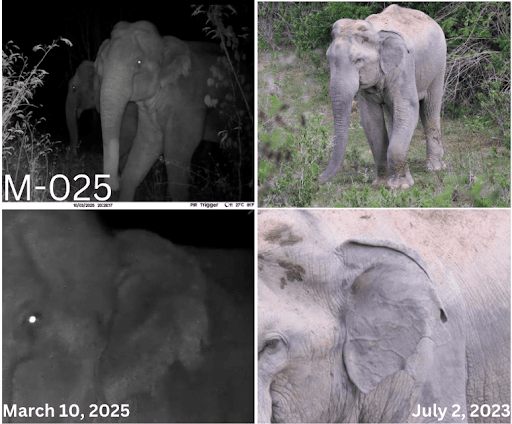 Een van de olifanten die het vaakst wordt gezien bij de farms aan de randen van het park, is M-025, een 40-50 jaar oude mannetjesolifant.