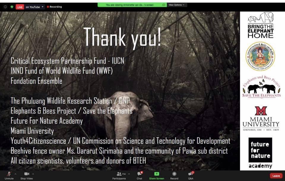 In een webinar op vrijdag 18 september presenteerden Bring The Elephant Home, the Future of Nature Academy, Miami University’s Project Dragonfly en een collectief van internationale olifantenonderzoekers de nieuwe publicatie “Bijenkorfhekken als een duurzame lokale oplossing voor conflicten tussen mens en olifant in Thailand” en andere innovatieve projecten voor het behoud van olifanten.