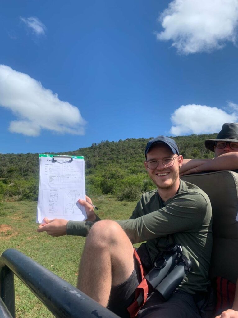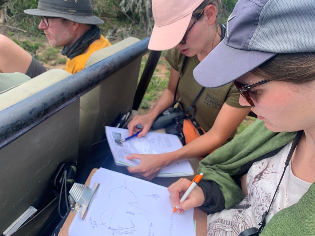 Op deze onderzoeksdagen gaan we met zijn allen in een open jeep het park in op zoek naar de olifanten. Zodra we een olifant, of liever een kudde olifanten, tegenkomen, heeft ieder zijn eigen taak om al deze gegevens te verzamelen. Zeker wanneer er meerdere olifanten tegelijk in zicht zijn kan dit soms een hele klus zijn, maar des te leuker de uitdaging voor ons. We hebben erg veel leuke observaties erop zitten, zoals een jong olifantje die lekker in een modderplas aan het spelen was en ook twee jonge bullen die op een speelse manier hun krachten op elkaar aan het testen waren in een spar ‘gevecht’.