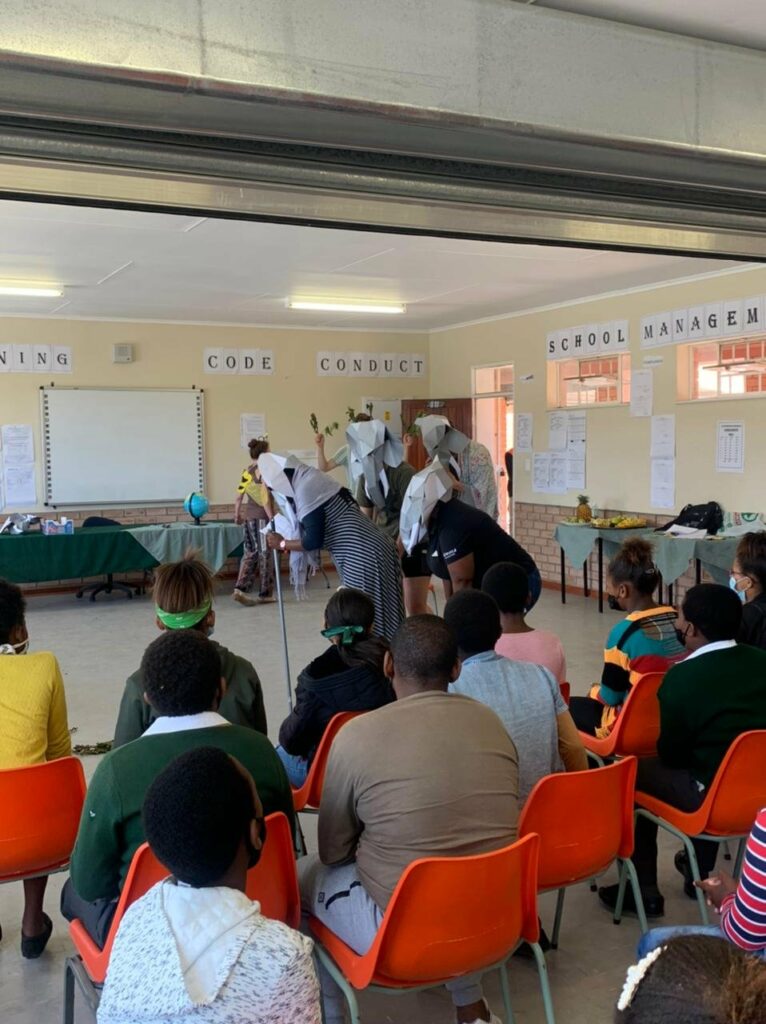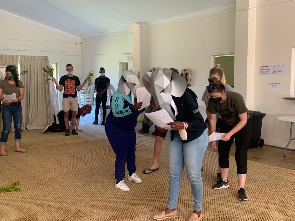 De lessen beginnen met een toneelstukje, waarin de rol van de matriarch (de oudste en wijste olifant vrouw in kudde die de groep leidt) wordt uitgebeeld. De Kariega vrijwilligers hebben hele mooie olifanten maskers gemaakt waarmee we de olifantenkudde kunnen uitbeelden. Een mensen moeder en dochter die de langskomende olifantenkudde bewonderen, spreken uit dat ze graag willen samenleven met olifanten. Ook komt er een stroper voorbij, die dan gelukkig op tijd worden gepakt door het anti-poacher team. Als afsluiter wordt er een mooi lied gezongen door de matriarchs, kippenvel!