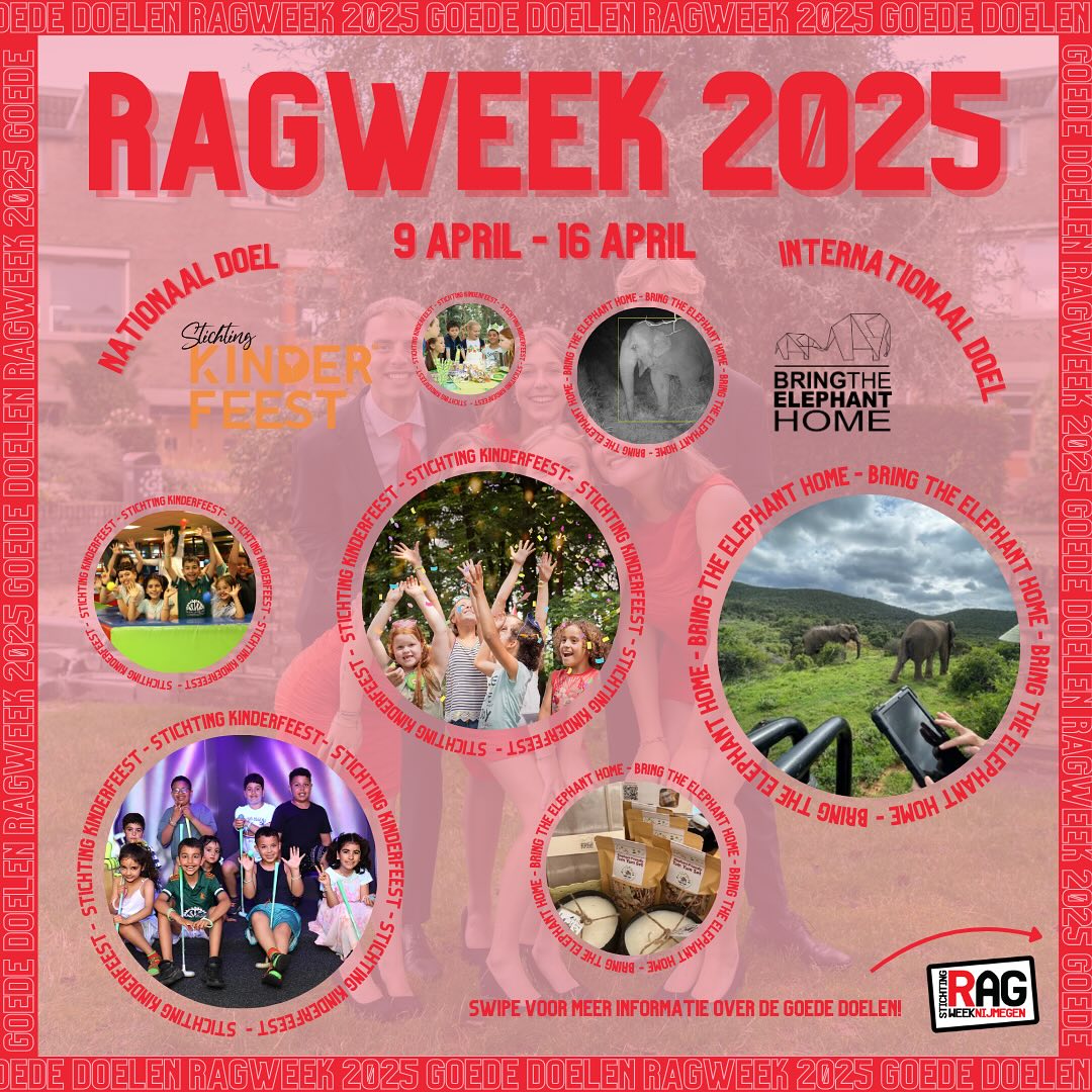 Elk jaar organiseert studerend Nijmegen de RAGweek, de komende editie is van 9 tot 16 april 2025. Studerend Nijmegen zal in die week allerlei activiteiten organiseren om geld op halen voor de goede doelen van de RAGweek. En dat zijn deze keer…. Stichting Kinderfeest en Bring the Elephant Home! Fantastisch, we kijken uit naar alle activiteiten en zijn enorm dankbaar voor de samenwerking!