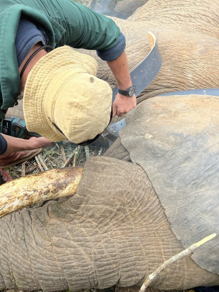 Naarmate de dag vorderde, werden de drie overgebleven olifanten met succes voorzien van een halsband, zij het dat de laatste stier in een meer uitdagende omgeving gedaan werd… in dichte struiken, wat het manoeuvreren om hem heen moeilijker maakte. Met behulp van een kettingzaag om dicht struikgewas te verwijderen, werd het gebied vrijgemaakt en werd de halsband met succes aangebracht.
