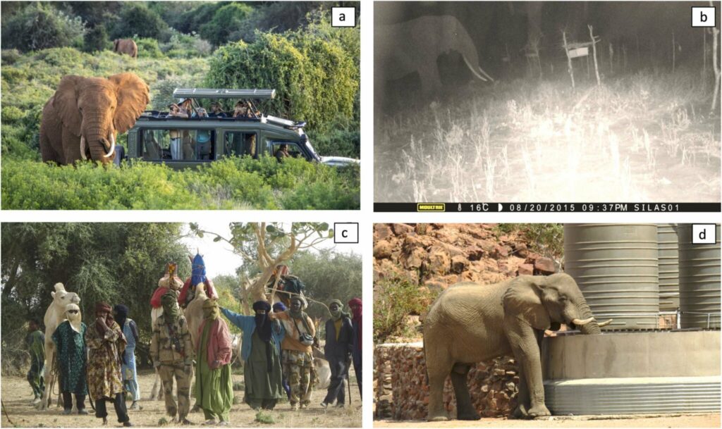 Examples of holistic elephant conservation approaches providing evidence of positive impact on integrity of nature and social cohesion: (a) community-based wildlife tourism contributing to reduced elephant poaching and peaceful coexistence in Kenya (photo credit: Labanowski, Save the Elephants), (b) bees help to deter elephants from farmland while increasing household income and social upliftment simultaneously in Kenya (photo credit: Van Fleteren, Save the Elephants), (c) an unarmed joint community/forester patrol to protect elephants and their habitat improves local livelihoods and equity in Mali (photo credit: the Mali Elephant Project, WILD Foundation/ICFC), and (d) by building protective walls around water points, Elephant Human Relation Aid protects water tanks and solar panels in a way that grants elephants access to water without them being able to cause damage to pipes or other infrastructure, supporting the wellbeing of people and elephants in Namibia (photo credit: Van de Water).‹ Terug naar vorige pagina