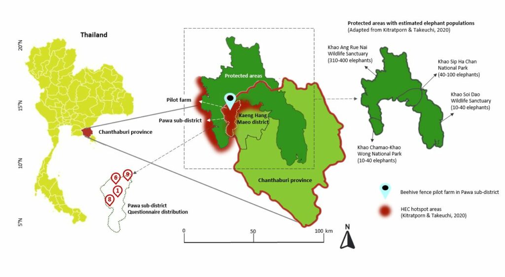 Our study was conducted in Kaeng Hang Maeo district of Chanthaburi province in Eastern Thailand, an area of high human-elephant conflict, consisting of farmland surrounded by Protected Areas.
