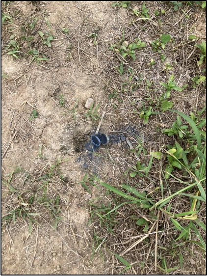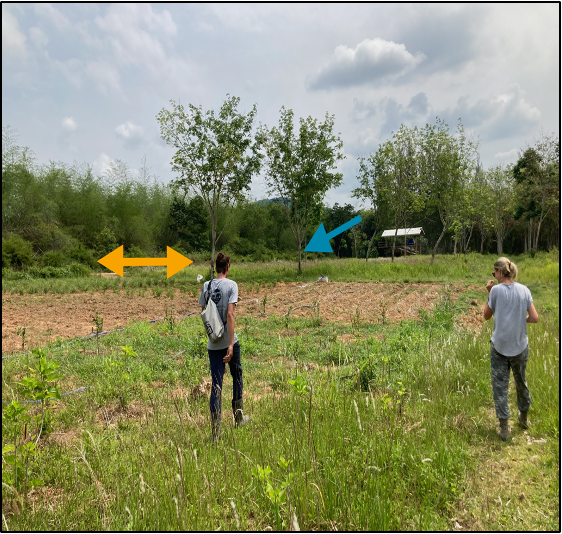 The first camera trap was placed behind BTEH project manager David Owen’s house who lives on the border of the national park and the agricultural area of the village. David regularly sees elephants leave the national park at night and walk through a pathway behind their house to enter the agricultural fields. The arrow in orange in the image to the left indicates the path where the elephants are often seen leaving the national park to enter the agricultural areas. The arrow in blue indicates the placement of the camera trap. The plots in front of the arrows are experimental plots growing chili, mulberry, and other aromatic crops that may be less palatable to elephants as part of David Owen’s MSc research project.