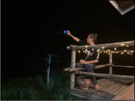 The camera traps and transect tape were erected around dusk and the group was going to head back to David’s house (which can be seen close by in the distance) for dinner and return to the tree to start trialing the camera traps once dark. Before leaving it was briefly discussed if the camera trap should be turned on but decided against it as it would still be typically too early for the elephants to come out (they like to come out well after 10pm). David also mentioned that they hadn’t seen the elephants in quite some time.
