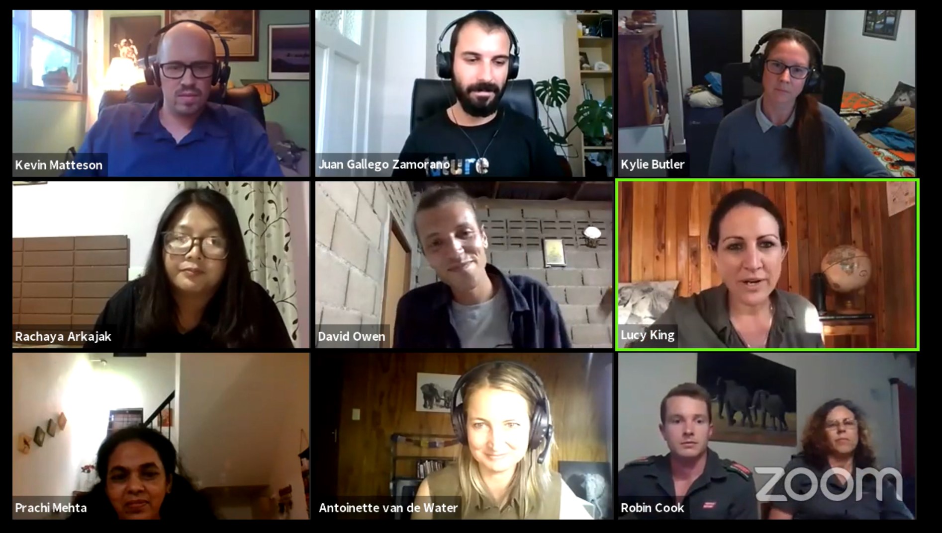 Presenters included Antoinette van de Water (BTEH, South Africa), Dr. Lucy King (Future for Nature Winner, Save the Elephants, Kenya), Dr. Kevin Matteson (Project Dragonfly, Miami University), Kylie Butler (beehive fence study in Sri Lanka), Dr. Prachi Mehta (Wildlife Research and Conservation Society, India), Dr. Michelle Henley and Robin Cook (South Africa), Rachaya Arkajak (Phuluang Wildlife Research Station, Thailand) and David Owen (Miami University, BTEH, Thailand).